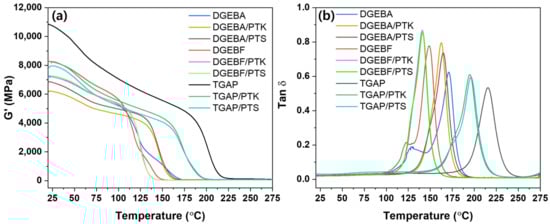 Figure 9 and Table 2 depict the dynamic mechanical properties of the prepared epoxy samples. The DGEBF epoxy sample with 3,3′-DDS curing agent showed the lowest Tg at 148.7 °C, while the TGAP epoxy sample showed the highest Tg at 215.5 °C. The PTK- and PTS-toughened epoxy resins exhibited 8–20 °C and 7–19 °C lower Tgs compared to that of the untoughened epoxy because the Tg of PTK and PTS themselves were lower than that of untoughened epoxy. There was a slight decrease after toughening with PTK or PTS but excellent thermal properties were maintained. Except for DGEBF, DGEBA, TGAP/PTK, and TGAP/PTS, one peak was observed in the tan δ curves of the prepared epoxy samples. However, in the tan δ curves of DGEBF, DGEBA, TGAP/PTK, and TGAP/PTS, minor or shoulder peaks were observed. Minor or shoulder peak may appear due to the phase separation between the epoxy resin and the toughening agent or inhomogeneous crosslinking density [26,27,28]. In the morphological analysis (Figure 6), phase separation was not observed. The 3,3′-DDS used for curing the epoxy resin has two primary amine groups and it can react with four epoxide groups to form crosslinks. During the mixture process at 90 °C, the epoxide groups and hydroxyl groups of epoxy resins can react, increasing the molecular weight of epoxy resin itself. This will reduce the amount of epoxy groups and cause unreacted amine groups of the curing agent, resulting in the inhomogeneous crosslinking density. Therefore, minor peaks or shoulder peaks appeared due to the inhomogeneous crosslinking density [28].