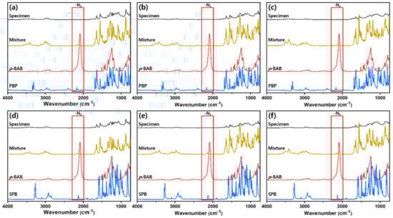 The in situ polymerization of p-BAB and PBP (or SPB) during epoxy curing reaction was confirmed using FT-IR to analyze the mechanical properties of the prepared epoxy samples. Figure 10 showed the acquired FT-IR spectra. The mixture of p-BAB, PBP (or SPB), epoxy resin, and curing agent is labeled as mixture and the cured mixture is labeled as specimen. As shown in Figure 10, the peak at 2100 cm−1 arising from the azide or acetylene of the p-BAB, PBP, and SBP disappeared after curing of epoxy resin. This result suggests that the p-BAB/PBP (or SPB) are successfully polymerized via azide-alkyne click reaction during epoxy curing reaction.