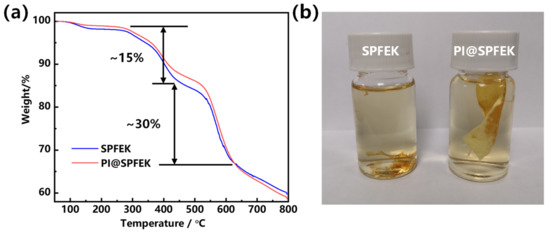 (a) Thermogravimetric (TG) analysis curves of SPFEK and PI@SPFEK composite membranes; (b) Photograph of SPFEK and PI@SPFEK composite membranes after 1 h of treatment with Fenton’s reagent (3% H2O2, 4 ppm FeSO4) at 80 °C.