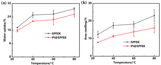 (a)Water uptake and (b) area swelling rate of SPFEK and PI@SPFEK at different temperatures.