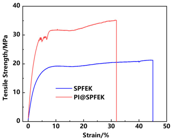 The mechanical properties of the proton exchange membrane seriously affect the life span of a membrane under real application conditions and then affect the structural stability of the MEA. In a hydrated state, the PI@SPFEK composite membrane showed a tensile strength up to 35.1 MPa, which is far higher than that of the pure SPFEK membrane with a tensile strength of 21.3 MPa (Figure 5). The remarkable improvement of tensile strength gives an outstanding rigidity to the composite membrane because of the introduction of the PI nanofiber mat. The results provide an effective method for the improvement of mechanical properties.