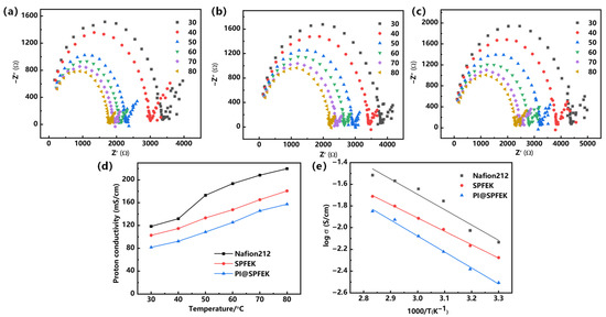 Nyquist plots of (a) Nafion 212, (b) SPFEK, and (c) PI@SPFEK. (d) Temperature dependence of proton conductivity of membranes and (e) Arrhenius plots of membranes. The cross-sectional area of Nafion 212, SPFEK, and PI@SPFEK composite membrane used for the proton conductivity tests were about 5 × 10−3, 5 × 10−3, and 7.0 × 10−3 cm2, respectively.