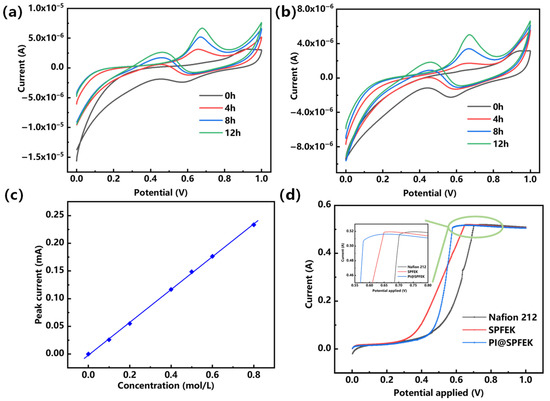 The crossover of methanol from the anode to the cathode can reduce the fuel conversion efficiency and result in low energy density and power density. Two electrochemical methods were used for the evaluation of methanol crossover. Figure 7a,b gives the CV (cyclic voltammetry) curves of the SPFEK and PI@SPFEK membranes by a traditional diffusion method over different diffusion times at room temperature. The methanol oxidation peak current is positively correlated with methanol content in solution. We can clearly see that peak current increased with time, indicating the unavoidable penetration of methanol throughout the membrane. Comparing the peak currents of the SPFEK and PI@SPFEK membranes, we can see that the PI@SPFEK membranes have a lower peak current under the same penetration time, which means they have a better methanol barrier ability. The methanol permeability of SPFEK and PI@SPFEK is 2.36 × 10−8 cm2 s−1 and 1.94 × 10−8 cm2 s−1, respectively. These values were calculated according to the calibration curve given in Figure 7c and are only 60% and 48%, respectively, of the methanol permeability of Nafion 212 (3.98 × 10−8 cm2 s−1). The LSV method was also applied to qualitatively assess the methanol permeability of those membranes. It can be clearly seen in the inset of Figure 7d, that PI@SPFEK shows the lowest peak current compared to that of Nafion 212 and SPFEK. It is well known that methanol permeability has a similar change trend to that of proton conductivity as methanol and protons share the same transportation mechanism. The hypothesis is well verified from above two methods.