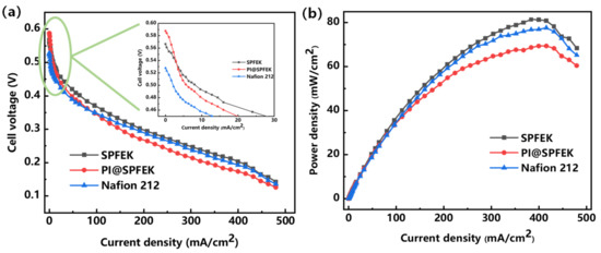For the purpose of evaluating the overall performances of SPFEK and PI@SPFEK under a real application condition, the MEAs from our membranes were fabricated and several single fuel cells were further assembled. The performance of these MEAs and others made from Nafion 212 were tested at 80 °C. Figure 8 gives the polarization and power density curves of SPFEK, PI@SPFEK, and Nafion 212. The PI@SPFEK composite membrane has an open circuit voltage of 0.59 V, which is the highest compared with those of SPFEK and Nafion 212, indicating the lowest methanol permeability is for PI@SPFEK (Inset of Figure 8a). SPFEK and Nafion 212 membranes show a similar polarization curve. For the PI@SPFEK membrane, the introduction of proton non-conductive PI nanofiber mats reduces the proton conductivity and exhibits a comparatively higher polarization than that of SPFEK and Nafion 212. As for power density (Figure 8b), SPFEK gives the best performance due to it having lower methanol permeability and acceptable proton conductivity. The results of the single cell performances of SPFEK, PI@SPFEK, and Nafion 212 are in good accordance with the discussion in Section 3.5. As a robust proton exchange membrane, the PI@SPFEK composite membrane shows acceptable and even higher power density when compared with that reported for other PEMs for DMFC applications [40,41].