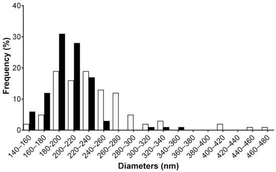 Size distribution of the fiber diameter for chitosan membrane in white and curdlan–chitosan membrane in black measured by image analysis with ImageJ on 100 randomly selected fibers.