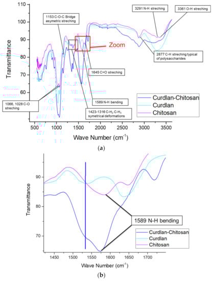 The chemical structure of chitosan (β-1,4-glucosamine) and curdlan (β-1,3-glucan) is similar. Therefore, both attenuated total reflection—Fourier Transformed Infra-red (ATR-FTIR) spectra show several similarities, such as -OH vibrations at around 3300 cm−1, -CH stretching at around 2900 cm−1, C-O-C asymmetric stretching at 1153 cm−1, and C-O stretching at 1066 and 1028 cm−1 []. However, some bands are more specific to a given polysaccharide: the N-H bending band exists only for chitosan, and a non-attributed band at 1530 cm−1 is present only in the curdlan spectrum.