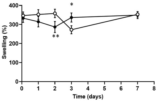 Swelling profile of the chitosan scaffolds (white dots) and curdlan–chitosan scaffolds (black dots) over time (* p < 0.05 et ** p < 0.01).
