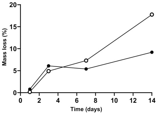 As shown in Figure 5, the enzymatic degradation of the chitosan scaffold was regular over time, with a loss of 15% of its original mass after 12 days. The degradation of the curdlan–chitosan scaffold was slower than the chitosan scaffold, losing 8.5% of its original mass over 12 days. This shows that the presence of curdlan decreased the degradation rate of the scaffold owing to curdlan’s resistance to hydrolysis and hydrolases []. This will allow the scaffold to maintain its mechanical properties for a longer period of time.
