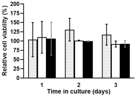 Metabolic activity over time of L929 mice fibroblast cells, control assays (dotted bars) and in the presence of pure chitosan scaffold (white bars) and curdlan–chitosan scaffold (black bars). Cell viability is expressed as % of the control evaluated at d0 (cells cultured in Dulbecco’s Modified Eagle’s Medium (DMEM) with 10% FBS). Values are presented as mean ± SEM.