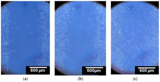 Scratch assay with L929 mice fibroblast cells after 24 h in serum-free culture medium without any scaffold under microscope at 10× magnification, (a) with dissolved non-stabilized chitosan scaffold, (b) and with curdlan–chitosan scaffold (c). The images are representative of 3 independent experiments.