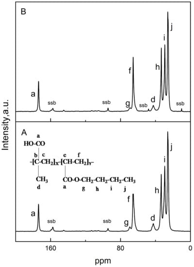 r-OCl-MAA) induces a different pattern in the sidebands of the nanocomposite. This is due to the fact that nanofillers induce the formation of ordered domains in their vicinity, not present in the amorphous MMA–BA copolymer. In the ordered domains, chemical shift anisotropy of polymeric backbone cannot be completely eliminated at the spinning rate used.