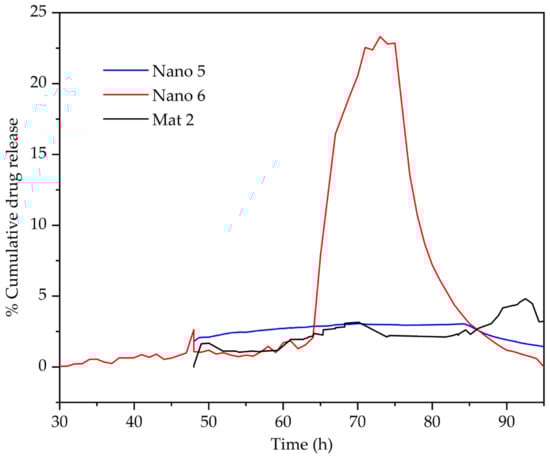 Figure 7 shows the hydrocortisone release profiles for pure MAA–BA copolymer Mat 2 and for the nanocomposites Nano 5 and Nano 6 obtained at pH 5. These nanocomposites, and their pure polymer matrix, were prepared with the same initial content of MAA (40 wt.%) and in the same way, they have a random chemical structure. It is evident that the amount of hydrocortisone released from Nano 6 is higher than those observed for the other two materials. At 73 h, Nano 6 releases 23% of hydrocortisone. These results contrast with the ones observed for Mat 2 and Nano 5. In this regard, the poor hydrocortisone release from Mat 2 indicates that this MAA–BA copolymer has little capability to act as a hydrocortisone carrier. These results mean that the type of CNTs