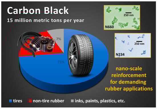 The most prevalent filler type in demanding rubber applications such as automobile tires and mechanical rubber goods is carbon black, which has many grades encompassing a large range of particle sizes (surface areas) and nano-structured aggregate morphologies for producing different property balances. There is ongoing research interest in employing other carbon allotropes (e.g., graphene, carbon nanotubes) for reinforcing elastomers [1,2,3], and the use of precipitated silica in rubber applications is growing [4]. However, carbon black is by far the dominant filler in rubber products. The global production of carbon black is 15 million metric tons per year, and 93% of this material goes into rubber applications (automobile tires (73%) and non-tire rubber products (20%)), with the remaining 7% used in paints, coatings, inks, and plastics compounding (Figure 1) [5]. This industrial importance of carbon black provides motivation for our review on the origin of the mechanical performance enhancements provided by carbon black in rubber compounds used in these challenging applications.