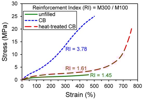 Perhaps the simplest way to look at the influence of CB on the mechanical behavior of elastomers is to compare unfilled and filled rubber in the standard tensile stress–strain test conducted at room temperature. Examples of such stress–strain curves from Medalia and Kraus [6] are reproduced in Figure 2, wherein the large impact of CB on the response can be noted immediately. One measure of filler influence on the stress–strain curve is to compare values of reinforcement index (RI) with and without filler, where RI = M300/M100. This ratio of the stress at 300% strain (M300) to the stress at 100% strain (M100) has a value of 3.78 for the CB-filled material shown in Figure 2 which is significantly greater than RI = 1.45 for the unfilled rubber. If the carbon black particles are heat treated, then the RI of the resulting rubber composite is only slightly higher (RI = 1.61) than the unfilled material. The remarkable extent of reinforcement from CB can be nearly extinguished by high temperature annealing of the filler.