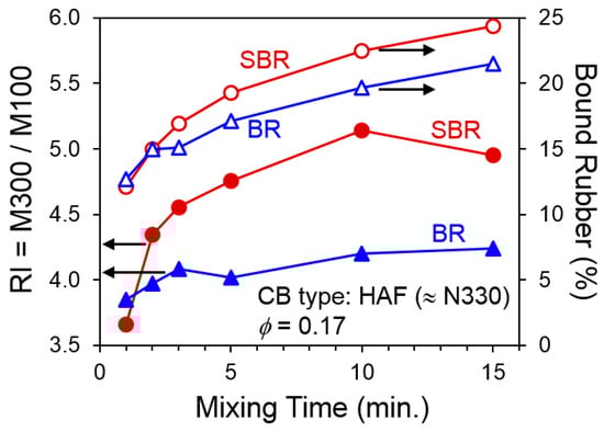 Another important aspect of the influence of CB filler on mechanical behavior is the observation that reinforcement index—steepness of the stress–strain curve—typically increases for longer mixing times. This is illustrated in Figure 3 using results from Brennan et al. [7] for CB-filled butadiene rubber (BR) and SBR materials, with the magnitude found to be larger for SBR in this particular study. Bound rubber also rises with increasing compounding time for both compounds.