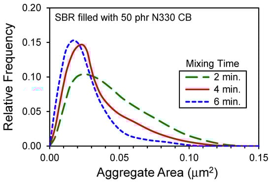 The rubber mixing process also affects the morphology of the carbon black aggregates. Carbon black is composed of primary particles that are fused into larger-scale, complex-shaped aggregates during the CB manufacturing process. Once the CB pellets/granules and then agglomerates are sequentially broken down and dispersed in the internal mixer, the aggregates are then exposed to the shearing forces and can fracture. Detailed analysis of transmission electron microscope (TEM) images from microtomed specimens from the cured rubber can allow aggregate size distributions to be characterized for investigating aggregate breakage. Some typical results published by Klüppel [8] are given in Figure 4 which show the shifting of the aggregate distribution to smaller sizes due to this breakage.