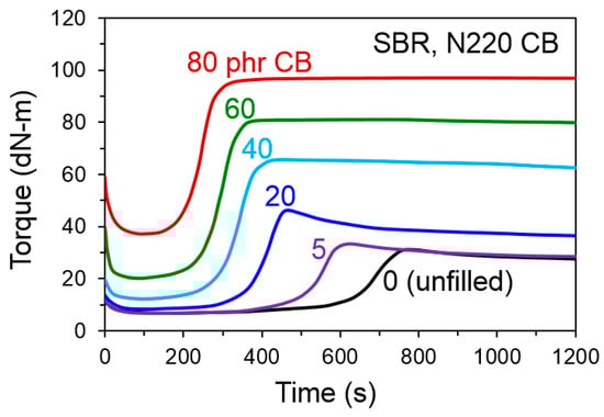 Rheological cure curves at 160 °C for sulfur vulcanization of SBR filled with N220 CB at the indicated loadings. Data replotted from Hossein and Razzaghi-Kashani [9].