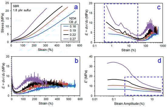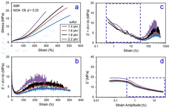 Effect of sulfur loading on tensile stress versus strain behavior at 23 °C (a) and its derivative (slope; modulus (E)) for CB-filled SBR plotted versus linear strain (b) and logarithmic strain (c). Unitless strain (not %) used when determining E. Also shown is strain amplitude dependence of dynamic storage modulus (E’) at 60 °C and 10 Hz (d). Each blue dashed-line box has the same dimensions in both (c) and (d) to allow comparisons of the strain-induced softening (Payne effect). Results are replotted from Warasitthinon and Robertson [11]. Accelerator to sulfur ratio was maintained constant in this study.