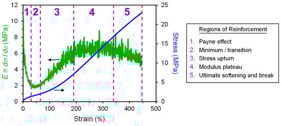Regions of filler reinforcement illustrated using tensile stress–strain curve and its derivative (slope; modulus (E)) for N234 CB-filled SBR (ϕ = 0.22) with 1.8 phr sulfur. Stress–strain data from Warasitthinon and Robertson [11]. Unitless strain (not %) used when determining E. The dashed vertical lines separate the five regions.