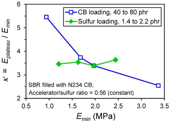 After the stress upturn regime is a zone (Region 4) where the modulus is constant at a plateau value, Eplateau. We propose a reinforcement index, κ = Eplateau/Emin, as a better indicator of the reinforcement capability of particles compared to the common RI = M300/M100. The strain range where the stress upturn in Region 3 occurs depends on crosslink density and filler loading (see Figure 6 and Figure 7), such that the 100% and 300% points on the tensile curve are in different places for different compounds. Some rubber compounds with higher crosslink densities or higher filler loadings have an ultimate elongation less than 300%, which precludes the use of the traditional reinforcement index, RI. The κ index is more fundamentally identified from the stress–strain response and thus universally applicable. The values of the strain boundaries for the various regions illustrated in Figure 8 are additional parameters that can be utilized for contrasting reinforcement effects in different elastomer formulations. This new reinforcement factor concept was applied to the data shown in Figure 6 and Figure 7, yielding the κ results in Figure 9. Distinct trends are noted for the dependences of κ on CB loading versus sulfur level. The κ is invariant to crosslink density but shows a significant decrease with increasing carbon black loading, suggesting that this index is sensitive to filler reinforcement effects in elastomers.