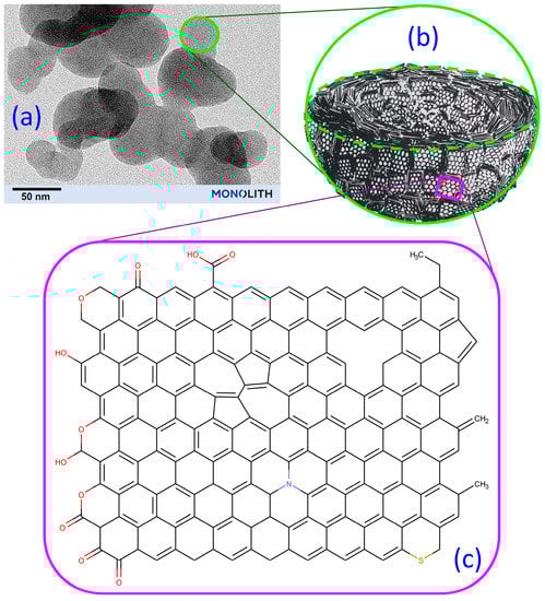 Different levels of structure and chemistry in carbon black: (a) TEM image of N660 carbon black at the indicated magnification; (b) schematic of a primary particle (cut in half to show the internal structure) that is composed of stacks of graphene sheets (adapted from Heidenreich et al. [48]); and (c) depiction of the different chemical groups on a graphene sheet in CB along with possible defects in the sheet. The various functional groups and defects are described in the discussion text.