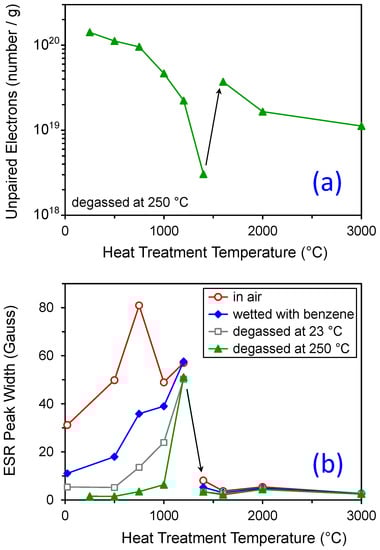 According to Figure 12a [59,60], the number of unpaired electrons at the carbon black surface was decreased to a minimum when the carbon black was heat treated at 1400 °C. It was also noted that the line width was considerably reduced in the material that had been heat treated to above 1400 °C (Figure 12b). These two trends suggest that the first peak consists of delocalized pi electrons that share many different resonance structures, resulting in a broad line width ESR signal. The second peak is most likely due to localized sigma unpaired electrons that exist at one carbon atom and do not share/exchange interactions. The more localized signals could be in part due to CO and CO2 that are known to be evolved from the surface during the heat treatment process.