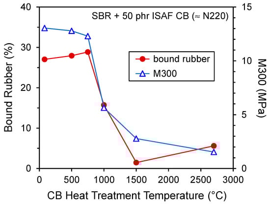 Bound rubber and M300 for SBR filled with ISAF CB (≈N220) versus CB heat treatment temperature. Results are replotted from Dannenberg [65].