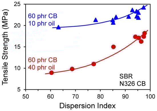 The stress upturn zone of the tensile response of rubber (region 3 in Figure 8) is not significantly affected by minor amounts of micrometer-scale CB agglomerates from insufficient filler dispersion during mixing. However, failure properties are closely linked to such crack precursors/defects in rubber [40,87], hence poor filler macrodispersion causes reductions in tensile strength and elongation at break. The presence of large filler agglomerates essentially shifts the ultimate softening and break behavior (region 5 in Figure 8) to lower strains. Typical CB dispersion effects on tensile strength from Hess and coworkers [88] can be seen in Figure 14. It should be mentioned that the aforementioned CB aggregate fracture and polymer chain scission that can occur during compounding will both be further promoted by efforts to improve filler macrodispersion by increasing shear rate and mixing time, for example.