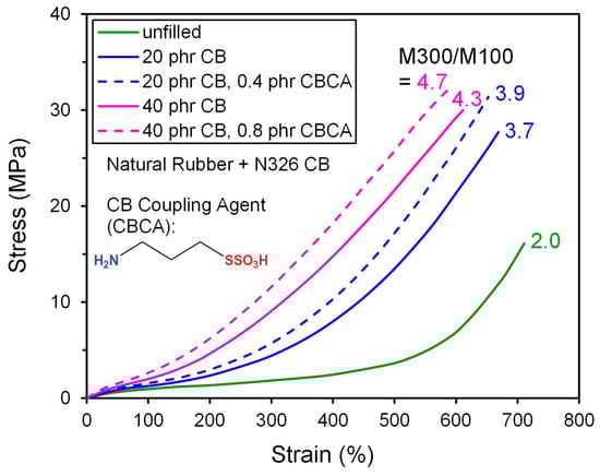 Tensile stress–strain results replotted from Han et al. [92] showing the reinforcement effects of adding the indicated coupling agent to N326 CB-filled NR formulations at two filler concentrations.