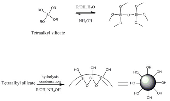 In the Stöber process (see Figure 1), tetraalkyl silicate is hydrolyzed by water in the presence of alcohol and ammonium hydroxide [23] and then undergoes condensation into spherical hydrophilic silica particles. By selecting the type of tetraalkyl silicate and alcohol, as well as their concentrations, particle size and reaction rates can be controlled.