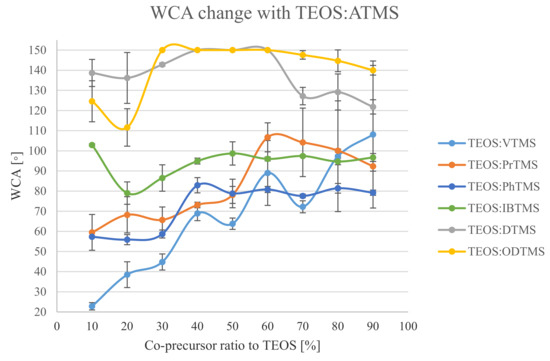 In short alkyl ATMS with low ratios of the co-precursor, the WCAs were mainly controlled by the TEOS. Additionally, when increasing the co-precursor concentration, an increase in the WCA was observed, to the point where the ATMS co-precursor was the dominant factor. Distinctively, the incorporation of the VTMS co-precursor resulted in a non-uniform coating, especially with the high VTMS ratios. This was probably due to the phase separation that manifested in large standard deviations of the measured WCA, ranging from 27.5 to 36.5°. The other used co-precursors were IBTMS, PrTMS, and PhTMS, and they demonstrated their surface tension effects in high ratios. The lowest obtained WCAs were for PhTMS, which had the highest surface tension. The highest WCAs were obtained with IBTMS system, which had the lowest surface tension.