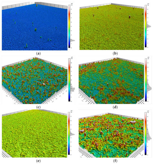 Surface skewness (Rsk) is an indication of roughness asymmetry. As such, a surface exhibiting a Gaussian height distribution would have an Rsk of zero [55]; in all systems, the skewness was positive, thus indicating random peaks and asperities [56]. Surface kurtosis (Rku) is an indication of the sharpness of a height distribution. A surface exhibiting a Gaussian distribution will have an Rku of 3 [55]. As manifested in Table 5, an Rku > 3 was obtained in all systems. As pointed out by Nahum et al. [52], skewness and kurtosis are not characteristics for SH, as also shown in this work.
