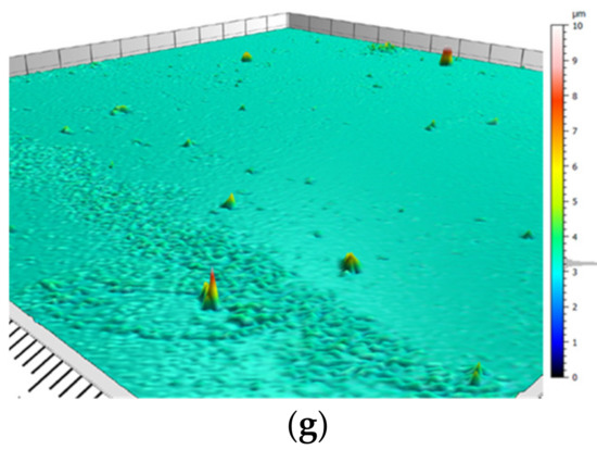 Confocal microscopy is generally limited to micro-sized roughness, while scanning electron microscopy allows for the sub-micron analysis of a surface. Thus, in Figure 7, micro asperities, as opposed to the nanometric asperities displayed in Figure 5 and Figure 6, can be observed. As stated before, both micro-and nanometric roughness are essential for hierarchal morphology to obtain SH coatings. As seen in Figure 7a,g, TEOS:DTMS at a ratio of 7:3 and TEOS:PrTMS at a ratio of 5:5, respectively, obtained almost smooth surfaces. When examining coatings of TEOS:DTMS ratios of 5:5 and 4:6 (as seen in Figure 7c,d, respectively), a rough surface was observed, while for ratios of 6:4 and 3:7 (as seen in Figure 7b,e, respectively), the surface was more uniform. The statistical analysis parameters (Table 5) indicated that the roughness was not sufficient to achieve SH. When comparing Figure 7c,d, it can be seen that the latter showed a high level of standard deviations (Table 3) and the confocal surface image resembled agglomerated particles, which might explain the WCA > 150° and the WSA > 10°, which is not considered to comprise SH.