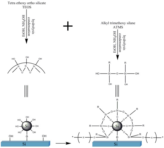 Superhydrophobic (SH) coatings based on sol–gel technology have been the subject of applied and fundamental studies [1,2,3,4], exhibiting a water contact angle (WCA) above 150° and a water sliding angle (WSA) lower than 5° [2,5]. Superhydrophobicity, as observed in nature, is characterized by a hierarchical morphology [6,7,8,9,10,11,12] comprising macro hills or pillars covered with nanometric roughness, the nature of which are three-dimensional epicuticular waxes [8,11,13,14,15] composed of long chains hydrophobic hydrocarbons. The need for roughness has been stipulated by Cassie and Baxter [2,7,16,17], supported by the fact that the WCA of the lowest surface energy of a smooth surface is 120° [13,18]. In a hierarchical structure, the contact area with the liquid is the smallest, and air is trapped between the surface asperities [13,19,20,21]. In addition to the synthesis of SH coatings, the sol–gel process can be used to prepare silica nanoparticles (NPs) by a process named after Stöber [22,23,24,25,26,27]. The Stöber process is based on a tetraalkyl silicate (TAOS) reaction with alcohol in the presence of alkaline solution and water. The end product is spherical hydrophilic silica NPs. The Stöber reaction starts with the TAOS’s hydrolysis to silanols, which condense into siloxane clusters that act as nucleates for silica NPs. By manipulating the reaction conditions, the size of the resulting NPs can be controlled [23]. The resulting silica NPs are hydrophilic by nature due to the hydroxyl groups formed on their surface, as illustrated in Figure 1.