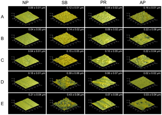 The atomic force microscopy (AFM) 50 × 50 μm2 images for each material and surface pretreatment condition: (A) Co-Cr; (B) Y-TZP; (C) Ce-TZP/A; (D) PEEK; (E) PEKK. The column was the surface pretreatment condition (NP, non-treatment; SB, sandblasting pretreatment using 50 μm mean particle size alumina (Al2O3) particles; PR, primer; AP, both sandblasting and primer). The sub-micro scale roughness (Ra) values of the flattened surfaces are shown in each image (means ± SD, n = 5).