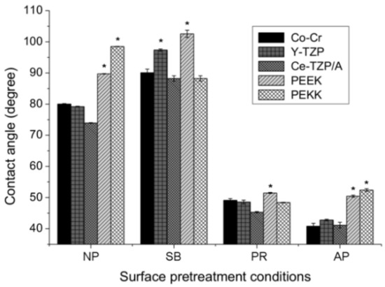 The contact angles of each material (Co-Cr, Y-TZP, Ce-TZP/A, PEEK, and PEKK) and surface pretreatment condition (NP, non-pretreatment; SB, sandblasting pretreatment using 50 μm mean particle size alumina (Al2O3) particles; PR, primer; AP, both sandblasting and primer). Note: * significant different to other materials (p < 0.05).