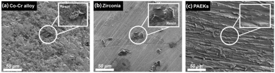 The representative debonded surface morphologies of each group of materials. The FE-SEM image (the magnification was 500× and the scale bar was 50 μm) of (a) the Co-Cr alloy (AP group, pretreatment with both sandblast and primer), (b) zirconia-based ceramic (PR group, primer pretreatment by priming with primer), and (c) (Poly)aryl–ether–ketone materials (PAEKs) (AP group). Residual denture acrylic debris was found in the Co-Cr alloy and zirconia-based ceramic, as shown in the magnified pictures, while the debonded surfaces of the PAEKs shown no residuals.