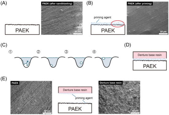 Bonding and debonding schematic diagram and FE-SEM images (the magnification was 500× and the scale bar was 50 μm) of (poly)aryl–ether–ketone (PAEK) materials. Firstly, the sandblasted surfaces of PAEKs retained their scratch characteristics (A). After the priming process, swelling bubbles were found on the surfaces of PAEKs (B). (C) The cavities shown in the figure are an enlarged schematic diagram of the irregular holes created by sandblasting. The volume shrinkage that occurred during the photopolymerization process was accompanied by the generation of bubbles (①). During the photopolymerization process, the bubbles would gradually move to the primer surface (②→③). After the photopolymerization was completed, if bubbles moved onto the primer surface (④), these would become swelling bubbles; if the bubbles adhered to the substrate wall (③), the contact area between the priming agent and PAEK would reduce. Schematic diagram of denture acrylic bonded to PAEKs is shown in (D). After the SBS test, the denture acrylic was debonded from the PAEK surface. According to the FE-SEM image (E), the appearance of the PAEK side (base material; left FE-SEM images) was the same as the sandblasting surface (A), while the denture’s acrylic side (adhesion; right FE-SEM images) was rough and uneven.