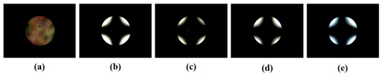 Conoscopic polarized optical microscopy images of the liquid crystal (LC) cells fabricated with PIEU100 films under the following weight ratios of PIEU100: (a) 0.001, (b) 0.01, (c) 0.05, (d) 0.1, and (e) 1.0 wt.%.