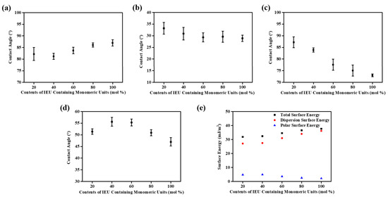 Contact angles of (a) water, (b) diiodomethane, (c) formamide, (d) ethylene glycol, and (e) surface energy values of PIEU# films according to the molar content of the isoeugenol moiety in the side groups.