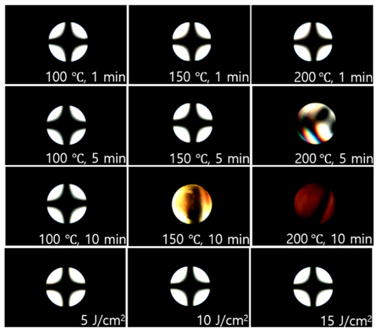 Concoscopic polarized optical microscopy images of the LC cells made using PIEU100 films, after thermal treatment at 100, 150, and 200 °C for 1, 5, and 10 min, and UV treatment at 5, 10, and 15 J/cm2, respectively.