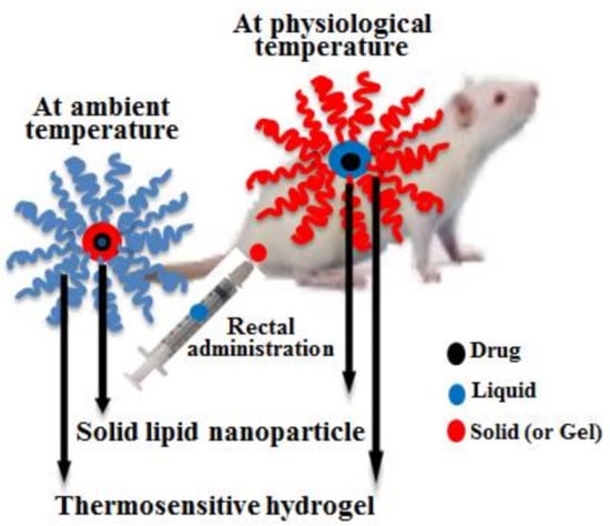 - ud Din, F.; Mustapha, O.; Kim, D.W.; Rashid, R.; Park, J.H.; Choi, J.Y.; Ku, S.K.; Yong, C.S.; Kim, J.O.; Choi, H.-G. Novel dual-reverse thermosensitive solid lipid nanoparticle-loaded hydrogel for rectal administration of flurbiprofen with improved bioavailability and reduced initial burst effect. Eur. J. Pharm. Biopharm. 2015, 94, 64–72. [Google Scholar] [CrossRef]