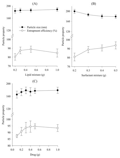 Effect of composites on the particle size and entrapment efficiency of SLN: (A) lipid mixture; (B) combined surfactants; (C) drug. Each value represents the mean ± S.D. (n = 3).