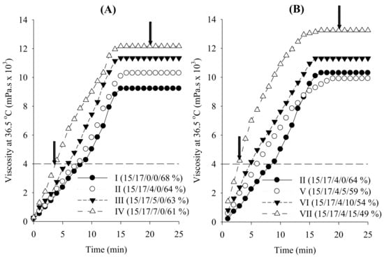 To investigate the impact of combined surfactant on the gel properties of DRTHs, the DRTHs were prepared with various amounts of the combined surfactant (0–7%) and deionised water (61–68%), keeping the amounts of P-407 and P-188 at 15% and 17%, respectively (Table 1; composition I–IV). As shown in Figure 3, when the DRTHs were inserted into the body, their viscosities were gradually increased followed by constant intrinsic viscosities. Tween 80 decreased the gelation temperature and gelation time but increased the viscosity at 25 °C and gel strength (Table 1; Figure 3). The hydrogel prepared only with 15% P-407 and 17% P-188 gave the gelation temperature of 50 °C, although it showed other suitable gel properties (Figure 3A; Table 1, composition I), indicating that it was unsuitable for DRTH. Thus, Tween 80 was necessary to control the gelation temperature of DRTH and improve the stability of SLNs in the DRTH [20,41,42]. Moreover, the hydrogel with the addition of 4–7% Tween 80 gave the gelation temperature of 32–37 °C (Table 1, composition II–IV), indicating a suitability for DRTH. In this study, as SLNs gave the tendency to decrease the gelation temperature, the hydrogel prepared with 4% Tween 80 was selected due to the relatively high gelation temperature.