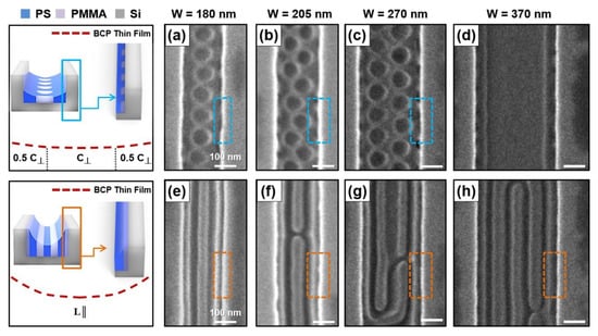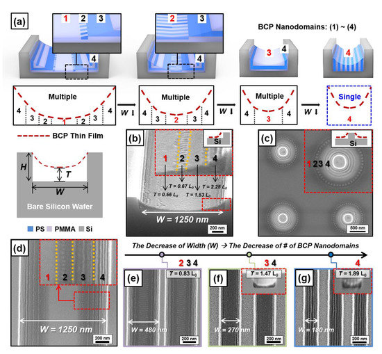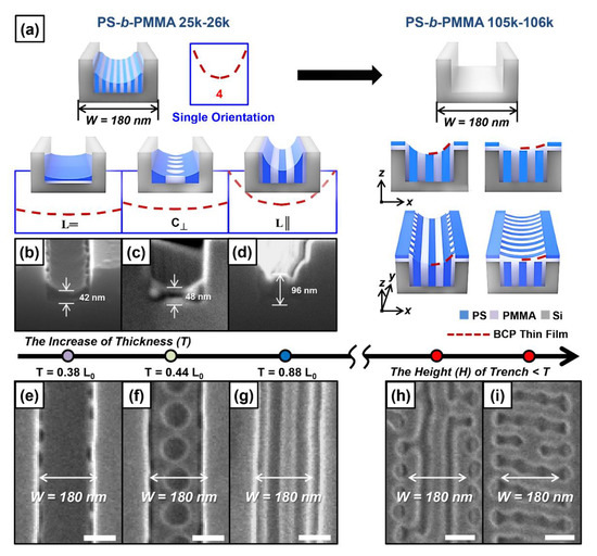 - There are two orthogonally oriented lamellar nanodomains when the BCP thin film thickness (T) is higher than the silicon trench height (H = 194 nm) (Figure 2h,i) [32]. This is a typical nanostructure that minimizes the total interfacial energy of the BCP nanodomain, and the orientation of the upper lamellar layer varies depending on the thickness (T = 244 and 274 nm in Figure 2h,i, respectively) of the BCP thin film [33,34].