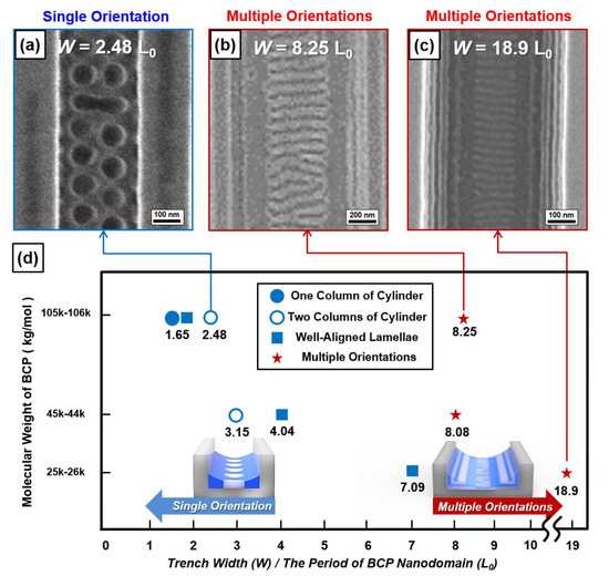 The following are available online at https://www.mdpi.com/2073-4360/13/4/553/s1, Figure S1. (a) The schematic illustration of the directed self-assembly (DSA) process of a thickness-modulated block copolymer (BCP) thin film inside bare silicon trenches. Cross-sectional SEM images of (b) silicon trenches and (c–d) thickness-modulated BCP thin films, Figure S2. Top-view SEM images of lamella-forming PS-b-PMMA nanodomains on a chemically neutral silicon substrate: (a) 25–26, (b) 44–45, and (c) 105–106 kg/mol, Figure S3. Tilted-view SEM images of the PS-b-PMMA thin film (44–45 kg/mol) inside a silicon trench: (a) W = 1250 nm, (b) W = 360 nm, (c) W = 270 nm, and (d) W = 225 nm, Table S1. Single/multiple orientations of lamella-forming BCP thin films inside various silicon trenches.