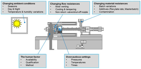 Malinowski [1] mentioned that, during processing, decreasing uncertainty related to product quality was a very important issue for injection molding processing, with environmental factors, plastic flow resistance, material changes, and human factors being considered to be causes of such an uncertainty (shown in Figure 1).