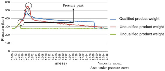 In this study, the viscosity index and peak pressure comprised the adjust criteria for the system. Figure 4 shows that a pressure curve with a higher peak pressure and larger area will indicate a greater product weight; otherwise, the product weight will be lighter. The peak on the pressure curve is the peak pressure Ppeak.