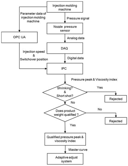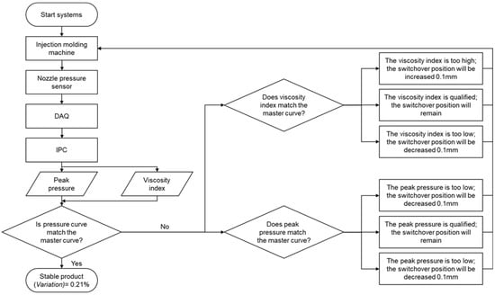 An adaptive adjustment system was developed in this study. The flow chart of the system is presented in Figure 7. The system uses the feedback pressure data from DAQ, and then uses the pressure data signal from the injection start to the packing end to calculate the viscosity index and peak pressure. The master curves derived from the preliminary experiments were used as the criteria by which to verify the product quality, where if the quality was verified, the process continued, and if the quality was unverified, the adaptive adjustment system stabilized the product quality by adjusting the injection speed and the switchover position before continuing the production process.