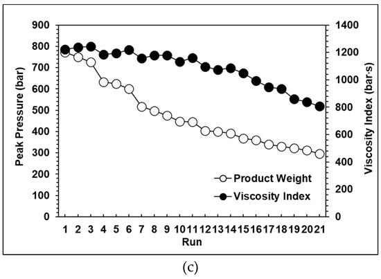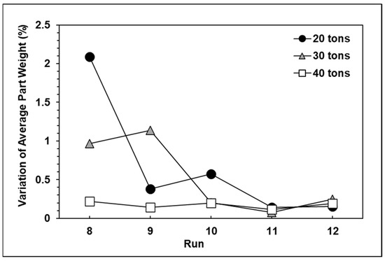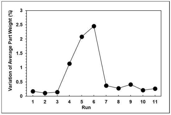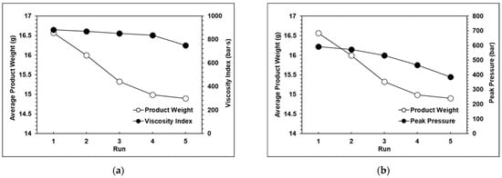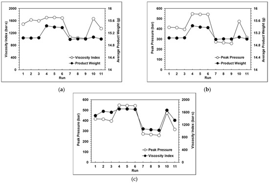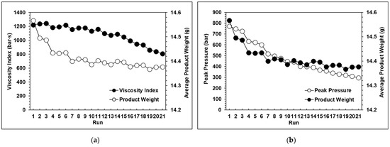 Based on Figure 14, the results show that the peak pressure, viscosity index, and product weight exhibited the same trend. Figure 15 shows that the variations of the product weight clearly decreased when compared to the results after eight seconds of packing.